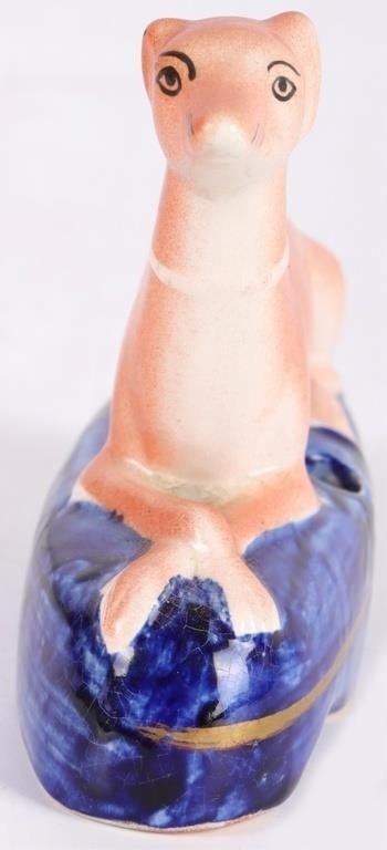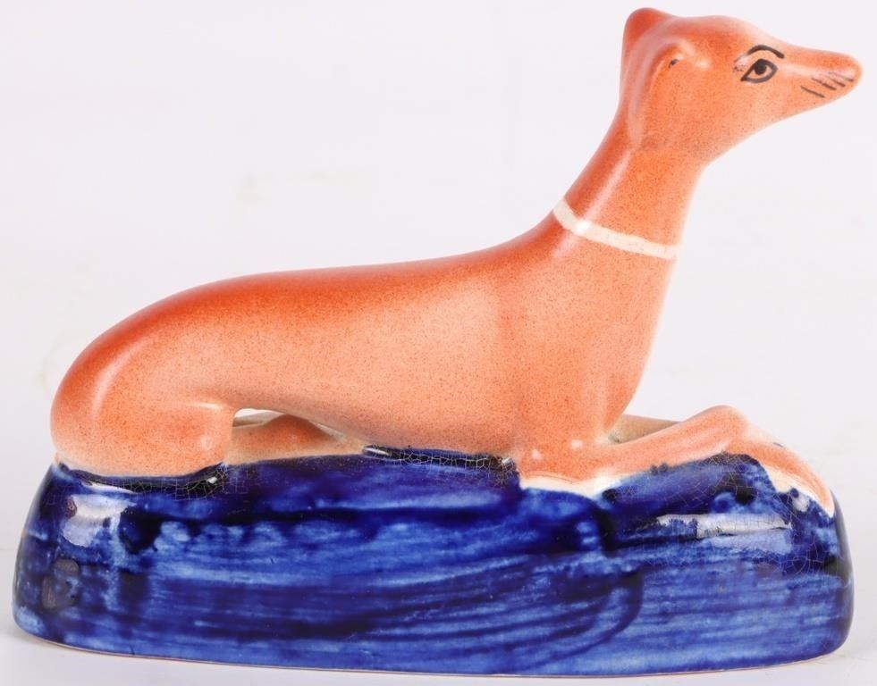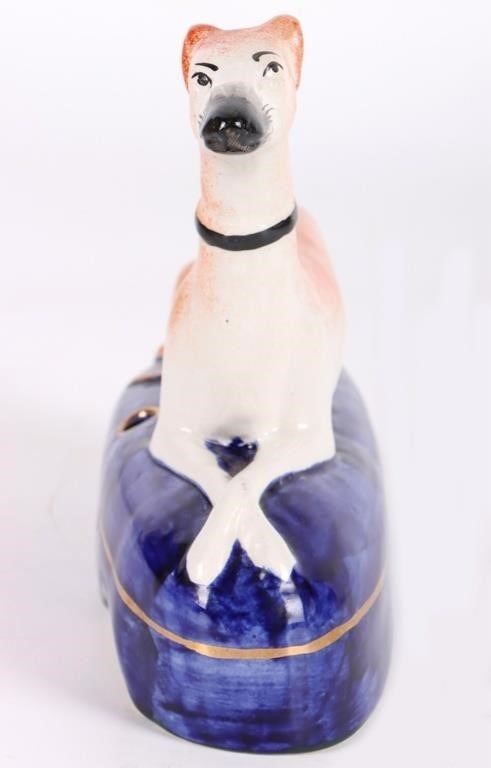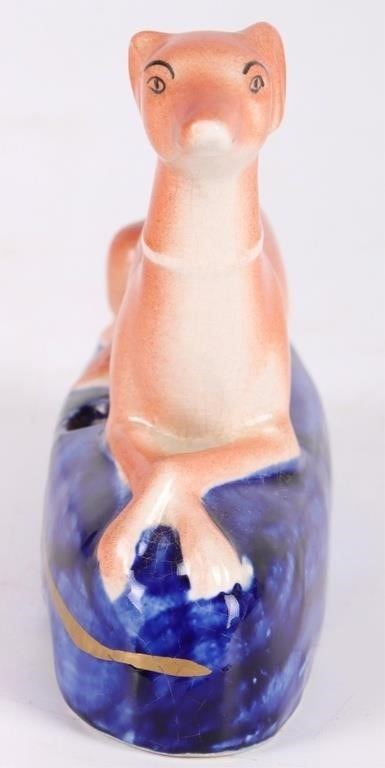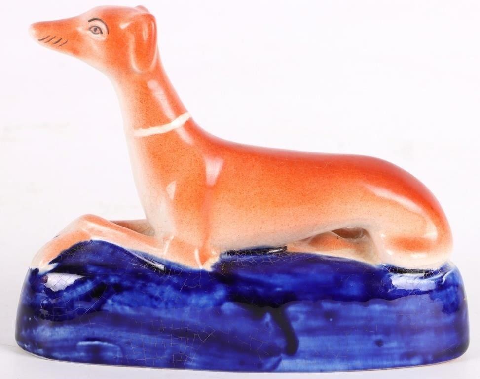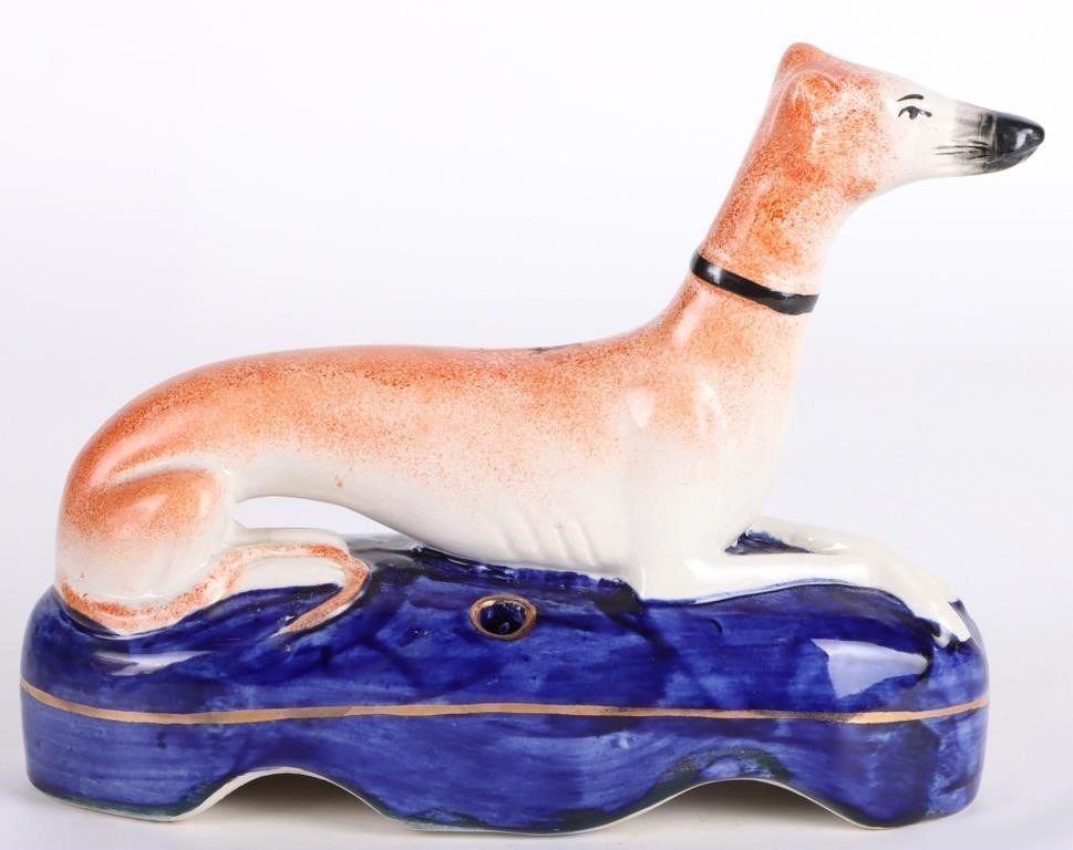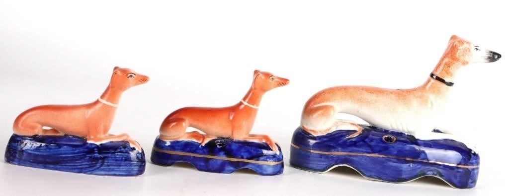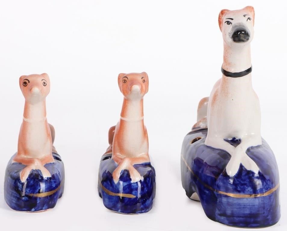 Set of antique Victorian Staffordshire whippet dog figurines with inkwells. The set comes with a large dog figurine and 2 smaller figurines. They were used as pen holders/inkwells.