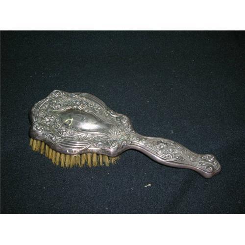 This is a great Sterling Silver hair brush for the dresser. The brush is marked Sterling on the handle. The boar brissles are held in place with a celluloid board. There are only two holes where brissles are missing. The back and handle are sterling silver in an Art Nouveau flowing floral master piece. The cartouch is monogramed with a G and this area is dented just a little bit. Everything else is in excellent condition. The brush is 9" long and 3-1/4" wide. I could not find any makers marks. Needs a good polish but otherwise perfect.