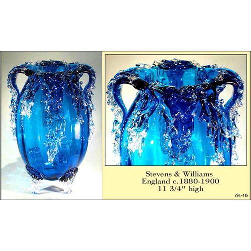 Please note that our Ebay Live Auction reserve is $950, which means that only bids at or above this amount will be successful and meet our reserve!!! Gorgeous monumental hand blown blue vase with free form crystal application over and between four handles. Stevens & Williams (England) circa 1890. Dimension : 11"H x 8" diameter.