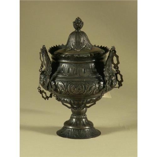 INCENSE CARRIER: A tin alloy Victorian style ornate bulbous shaped incense carrier with lid having an affixed trio of acanthus leaves with attached shaped chains, 10.5'' x 6''.