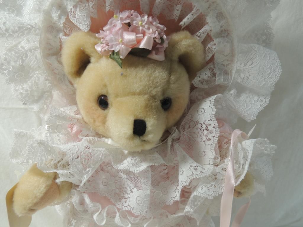 TEDDY BEAR DOLL PINK SATAIN AND LACE OUTFIT AND LAMB BEAUTIFUL DETAILED ON STAND AS SHOWN SEE PHOTO FOR MORE DETAILS.
