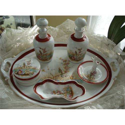 Beautiful Victorian vanity set consisting of 2 perfume bottles with original stoppers, handled tray, lidded jar, ring tree and trinket tray. The set is charmingly hand painted over transfer. In wonderful condition with normal gold wear to edges, but in even manner. A lovely set to decorate with and enjoy adding to your vanity- perfume bottles collection.