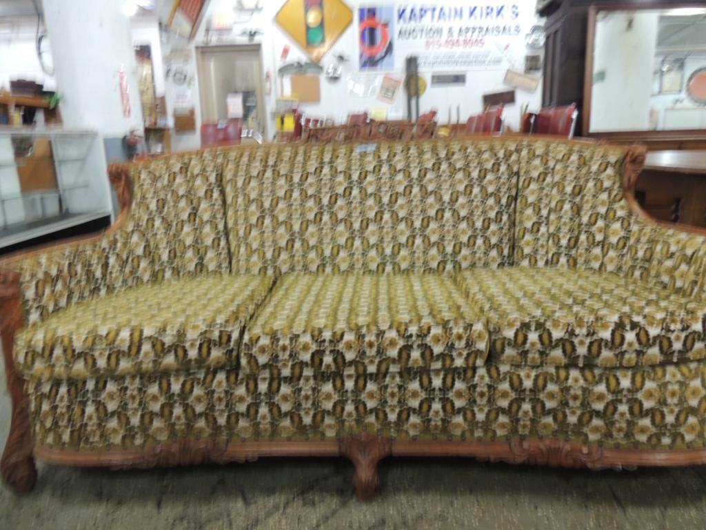 VICTORIAN VINTAGE SOFA UPHOLSTERED. GREEN AND MUSTARD YELLOW AS SHOWN. SEE PHOTO FOR MORE DETAILS.