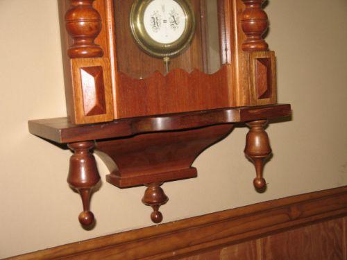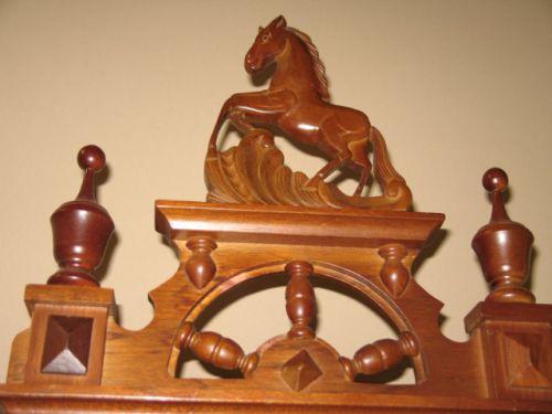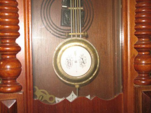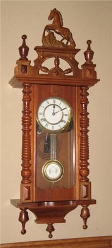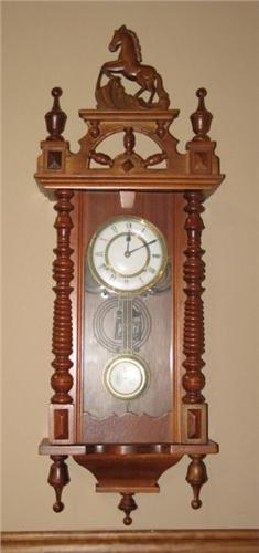 ORNATE VICTORIAN WALNUT WALL CLOCK. Ornately decorated with horse carving at top of galley. Has key and pendulum. Pendulum is marked “RA”. 34.25” H, 13.5” W, 6.75” D