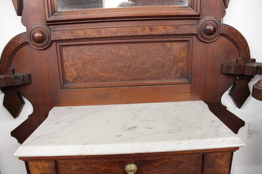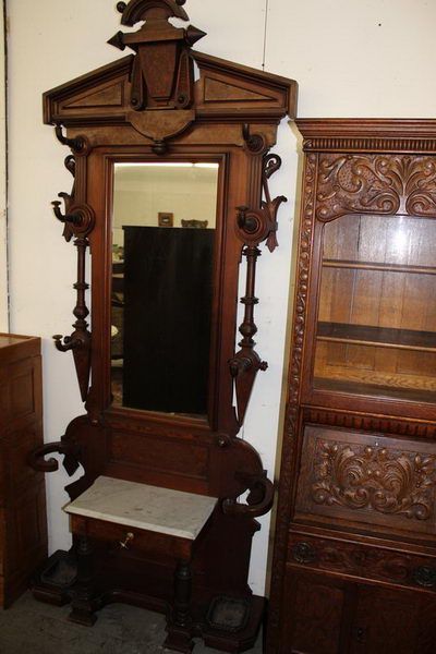 VICTORIAN WALNT PARLOR MIRROR AND UMBRELLA RACK WITH MARBLE AND DRAWER 98" TALL