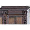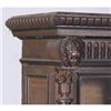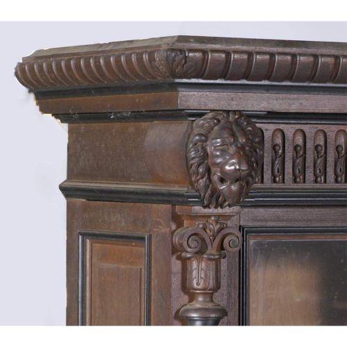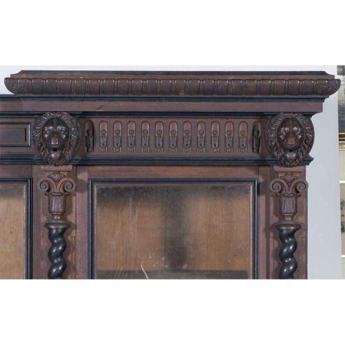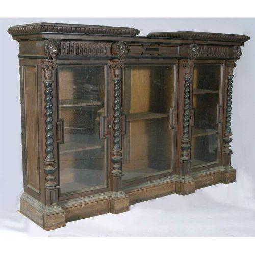 VICTORIAN WALNUT 3 DOOR BOOKCASE with lion heads 96" long, 64" high circa 1880 CONDITION REPORT: replaced handles, ill fitting shelf supports, finish original but dirty with some finish wear. Lions may have had rings. Impressive bookcase which comes apart for transport.