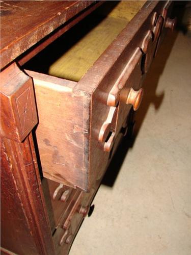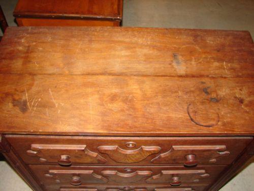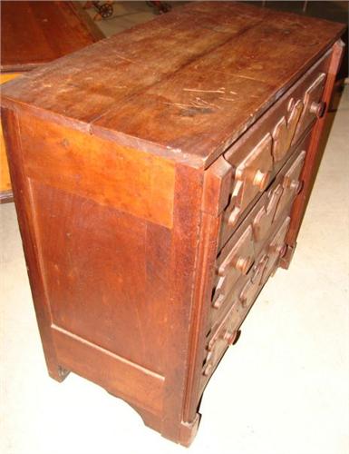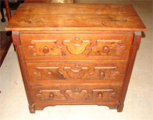 VICTORIAN WALNUT BACHELOR’S CHEST. Has three dovetailed drawers with applied burl walnut decoration at drawer fronts. Column decoration at sides of front and paneled sides. 29” H, 31” W, 14.75” D