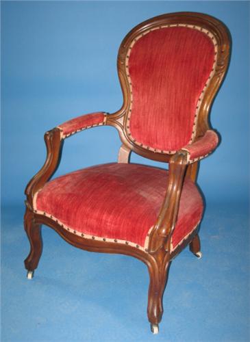 VICTORIAN WALNUT LADIES' ARM CHAIR. Red velvet upholstery shows some wear. Feet are on castors. 41" H to top of back, 23.5" W