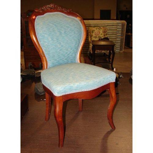 VICTORIAN WALNUT FINGER CARVED LADIES’ SIDE CHAIR. Finger carved rose decoration at top of back crest on cabriole legs. Blue velvet upholstered back and seat. 34” H to top of back, 17” W