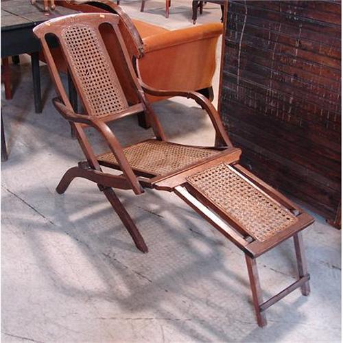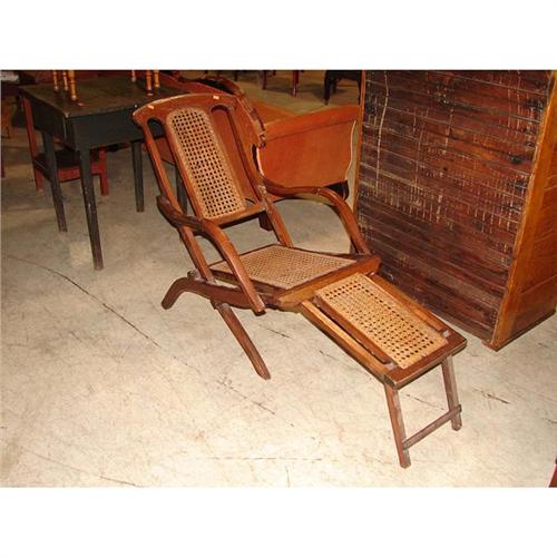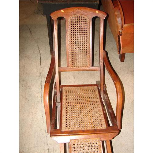 VICTORIAN WALNUT FOLD-UP LOUNGE CHAIR. Cane back, bottom, and foot rest. 31.5” H to top of back, 55” L