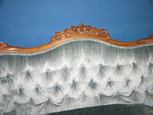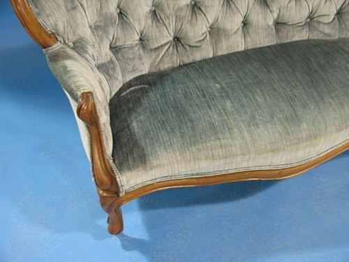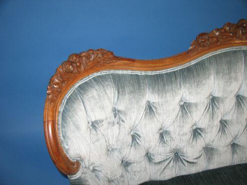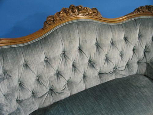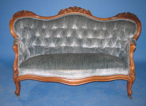 VICTORIAN WALNUT LOVESEAT. Ornately carved floral decoration at top of back. Has recently been reupholstered with aqua velvet upholstery. Feet rest upon castors. 35” H to top of back, 52” W, 15” H to top of seat.