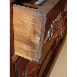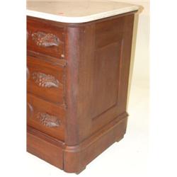 Victorian walnut marble top 3 drawer chest. Has white marble top with slight staining. Fruit carved pulls. Missing one small section of wood measuring .5" on right side of top drawer. 31.5" H, 46" W, 21" D