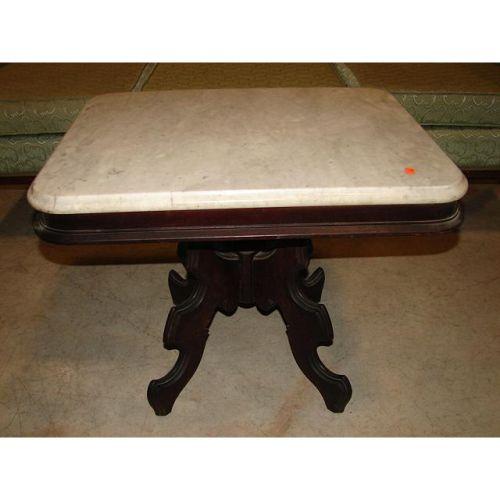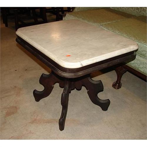 VICTORIAN WALNUT MARBLE TOP COFFEE TABLE. White marble top. On four shaped legs. 21” H, 26” L, 20” W