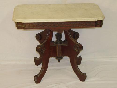 VICTORIAN WALNUT MARBLE TOP PARLOR TABLE (20" H X 26" L X 18" D) - SMALL 3" CRACK TO MARBLE, WEAR & IMPERFECTIONS