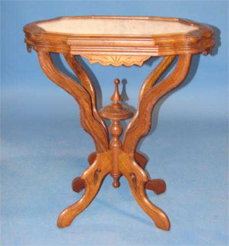 VICTORIAN WALNUT MARBLE TURTLE TOP LAMP TABLE. White marble top. 27.5” H, 25” L, 17.5” W