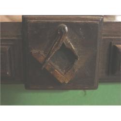 VICTORIAN WALNUT MASONIC WALL MIRROR. Half circle top. Decorated with relief Masonic decorations. Missing some decorations. 22" x 18"