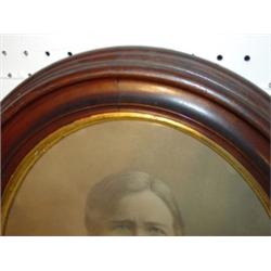 VICTORIAN WALNUT OVAL PICTURE FRAME with sketch of woman. Gilt decorated around edge of picture. 19.5" x 22.5" frame