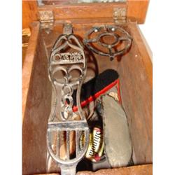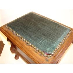 VICTORIAN WALNUT SHOE SHINE BOX on legs. Cast iron foot rest is marked "C & M". Original hinges and felt top. Slight mildew to bottom of feet. 15.25" H, 14.25" L, 11.25" W