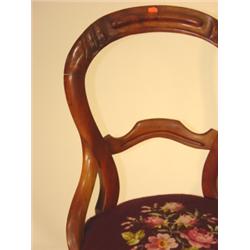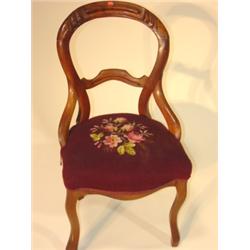 Victorian walnut finger carved side chair with needlepoint floral decorated seat. 34.75" H, 18" W, 18" H to top of seat.