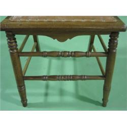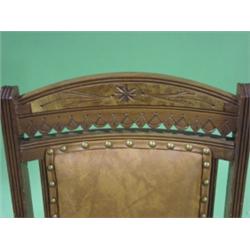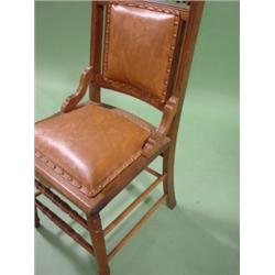 VICTORIAN WALNUT SIDE CHAIR. Vinyl seat and back. Ornately carved and decorated. 35" H to top of back, 17.5" W