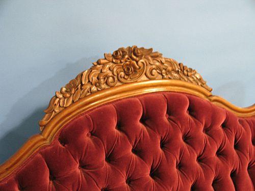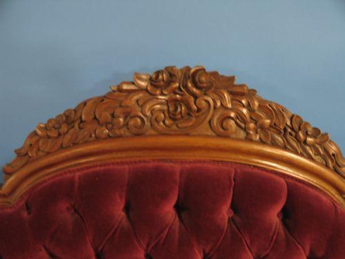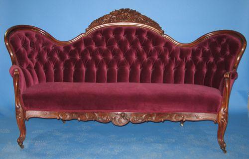 ORNATE VICTORIAN WALNUT SOFA. Ornately carved rose & floral decoration at top of back and along apron at bottom of seat. Has recently been reupholstered with purple upholstery. 43” H to top of back, 74.5” W, 16” H to top of seat.