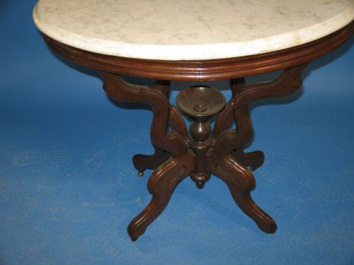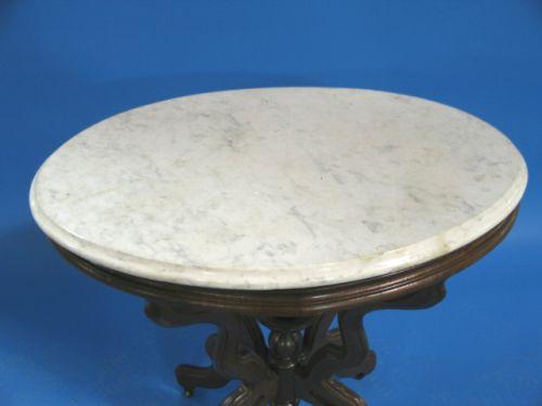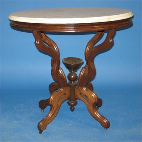 VICTORIAN WALNUT MARBLE TOP TABLE. White marble oval top shows minor staining. Feet rest upon four castors. Carved finial with bowl top in center of base. 30.25” H, 30” L, 19.5” W