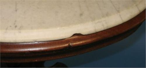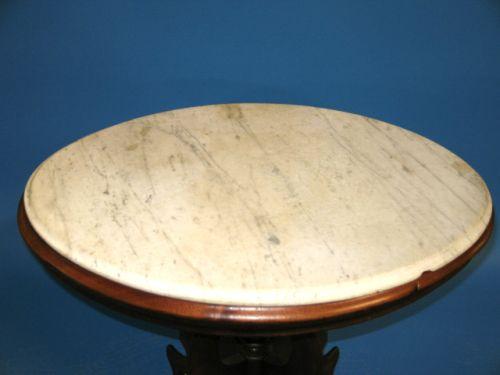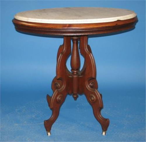 VICTORIAN WALNUT MARBLE TOP TABLE. White marble oval top shows staining. Marble top has one chip along edge. Feet rest upon four castors. 29.5” H, 29.5” L, 20.25” W
