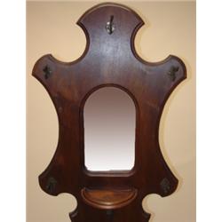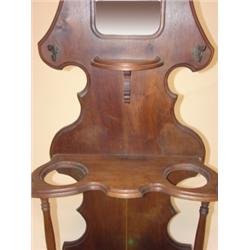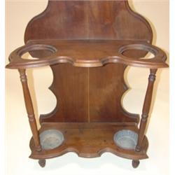 Victorian walnut umbrella rack. Two agate ware insert pots at bottom. 83.5" H, 31" W, 13.75" D