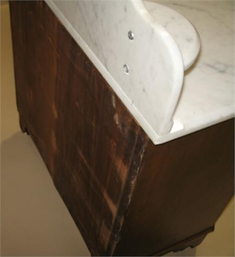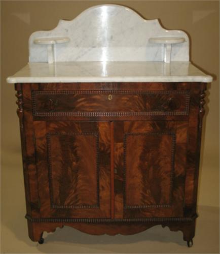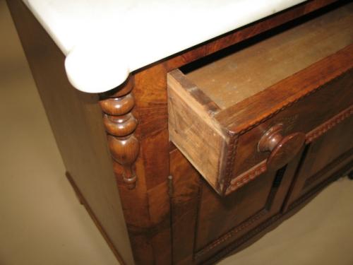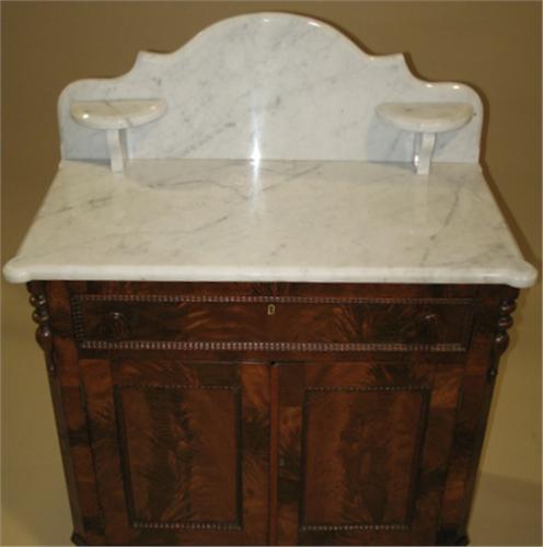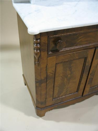 ORNATE VICTORIAN WALNUT MARBLE TOP WASHSTAND. Splash back. Single drawer over two doors. Excellent condition. 41” H to top of back, 31.5” W, 16.5” D