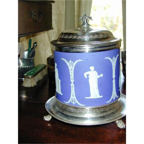 Mounted on a silver plated base, it posseses a silver plated top a ring around the top of the barrel. The barrel itself is made of blue jasperware with neo-classical Greek ladies and neo-classical dividers bewtwen each figure.