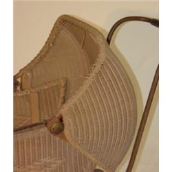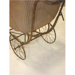 Victorian wicker baby carriage. Some condition problems to wicker on top of bonnet. Some looseness to wicker around edges. Missing rubber on all four wheels. 38" H