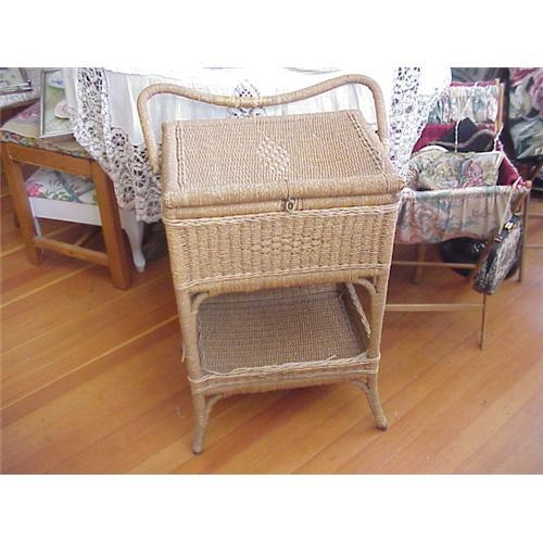 Beautiful Victorian natural wicker sewing or knitting stand. This is a wonderful never painted stand. It is in very good condition, a little bit of unraveling on the handle where someone had taped it and by the catch there is a little damage, and bottom shelf edge has unraveling. It is otherwise in very good sturdy condition, displays beautifully and is most useful. Perfect for the Shabby Chic Romantic homes decor!