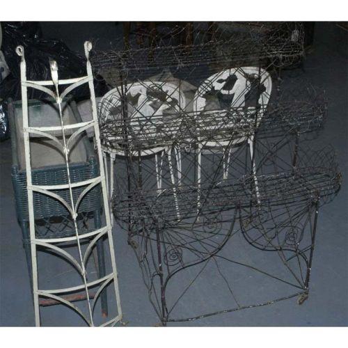 VICTORIAN WIRE PLANTER, together with WICKER PLANTER and METAL PLATE STAND, condition: tears and bends to wire,