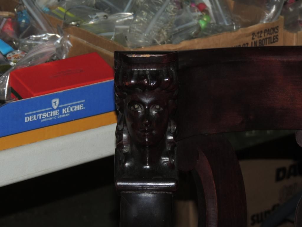 VICTORIAN LOVESEAT BENCH RED VELVET CUSHION. HEAD CARVED DETAIL CARVED ON SIDE. AS SHOWN. SEE PHOTO FOR MORE DETAILS