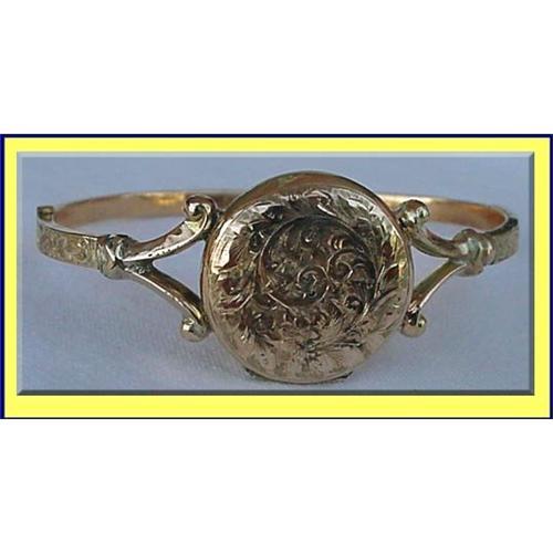 <tr><td><font size="2" face="Arial, Helvetica, sans-serif"><strong><font color="#000033">Title:</font></strong>VICTORIAN YELLOW GOLD ENGRAVED LOCKET BANGLE</font></td></tr>