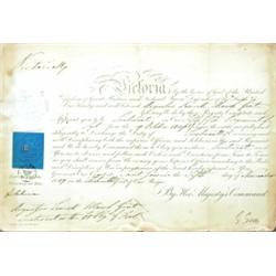 <b>897. VICTORIA </b>Partly-printed D.S. 1p. oblong folio, London, Nov. 5, 1849 appointing Augustus Marin as a Lieutenant in the 55th. Regiment of foot. Light damp stains and uneven toning, light vertical folds, otherwise very good.<b> $200-300</b>
