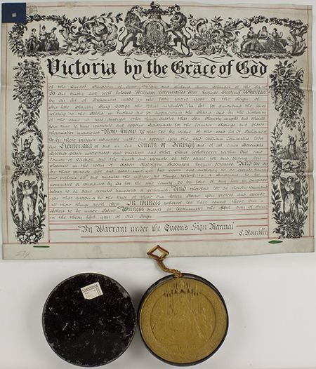 (1819 - 1901) Queen of England, reigned during the Crimean and Boer Wars, abolished the East India Company, brought Disraeli to power as Prime Minister, and is considered the symbol of a unified British Empire. Fine partly-printed document (not signed), "thirty-fifth year of our reign", a military commission with an enormous hanging yellow wax seal depicting Victoria on the throne. The seal is housed within the original case and is fully intact. Document in very fine condition, striking for display.