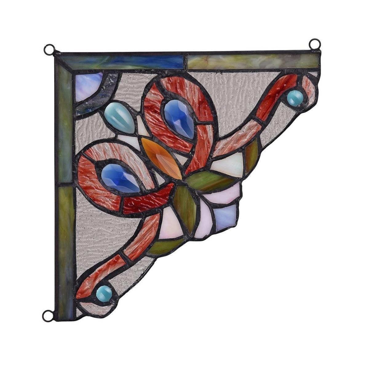 VICTORIE, a Victorian style stained glass window panel features a gorgeous design with will bring beautiful colors into your home. Hand crafted from over 35 pieces of art glass, 2 glass beads and 4 crystals. Main colors are rosy-pink and sky-blue. Handcrafted using the same techniques that were developed by Louis Comfort Tiffany in the early 1900s, this beautiful Tiffany-style piece contains hand-cut pieces of stained glass, each wrapped in fine copper foil.