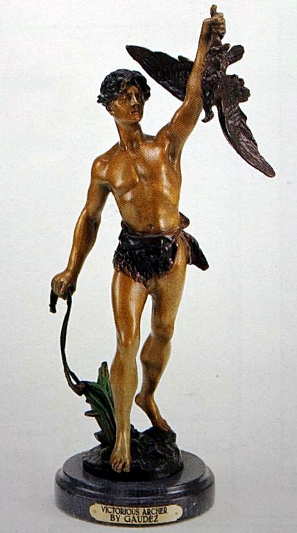 "VICTORIOUS ARCHER" BRONZE SCULPTURE - AFTER GOUDEZ - BEAUTIFUL COLOR PATINA - MOUNTED ON A FINE ITALIAN MARBLE BASE - BEAUTIFULLY DETAILED - SIGNED - MINT CONDITION - 18"H X 6"W - LOST WAX CAST BRONZE