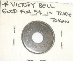 VICTORY BELL *GOOD FOR 5 CENTS IN TRADE* TOKEN *NICE EARLY TOKEN*!! TOKEN CAME OUT OF SAFE BOX!! ***Coin, Currency & All Items Listed in this auction - Grades, Conditions and Values are not Safe Deposit Coins LLC Responsibilty. Grades, Condition and Values are determined by Consigner(s) & Buyers ONLY