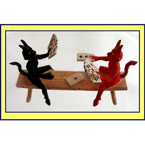 Miniature Vienna Bronze sculpture of a red and a black devil sitting on a bench and playing cards / gambling. Made Austria, late 19th century.<BR>Measures: 1 3/4inch accross and approx 1 1/8inch high.<BR>A red and a black devil sit on a bench playing cards. Wonderful detail and tremendous humour. Each card is visible. Excellent condition for it's age with very minor paint loss.