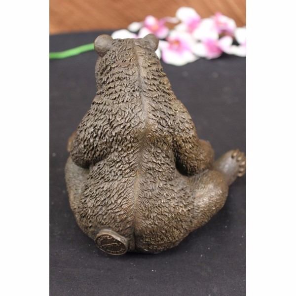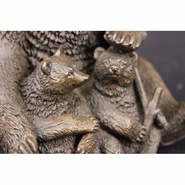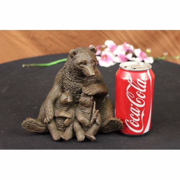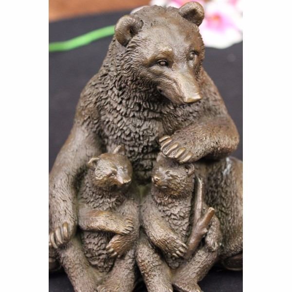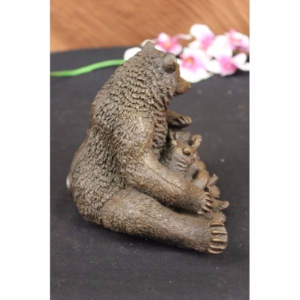 The mother bear sits upright with her two dear cubs nestled in the warmth of her fur and love. She stares out from under knitted brows with an expression of happiness as both her cubs suspend their folly to stare at each other before commencing yet another round of play-fighting. The symbolic beliefs of the bear totem signifies primal power, motherhood, cunning, healing, gentle strength, dreaming, sovereignty, intuition married with instinct, nurture and protection. The handmade bronze sculpture was created using the ancient method of lost wax casting and stained with a brown patina finish for preservation and the artist Kamiko's signature. Condition: This sculpture is in perfect condition. Bronze Dimensions :Height 6 1/2" x Width 6 1/2" Weight : 5 LBS Inventory : 27X07712772