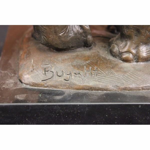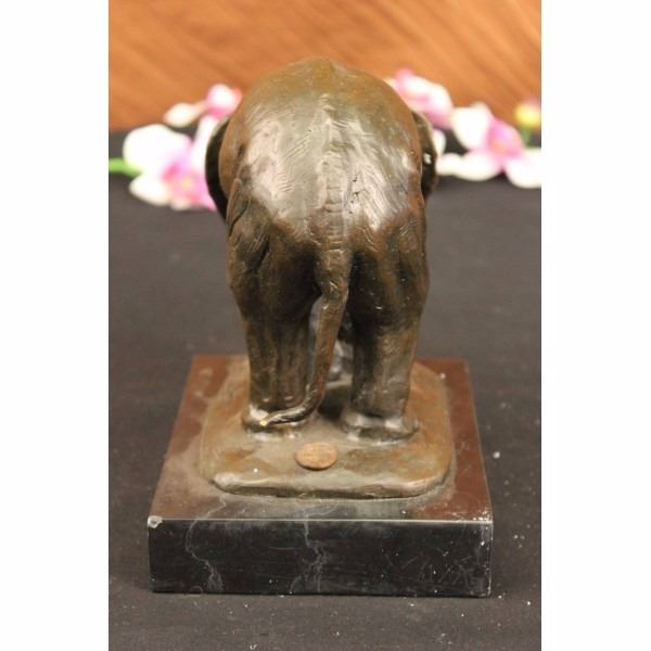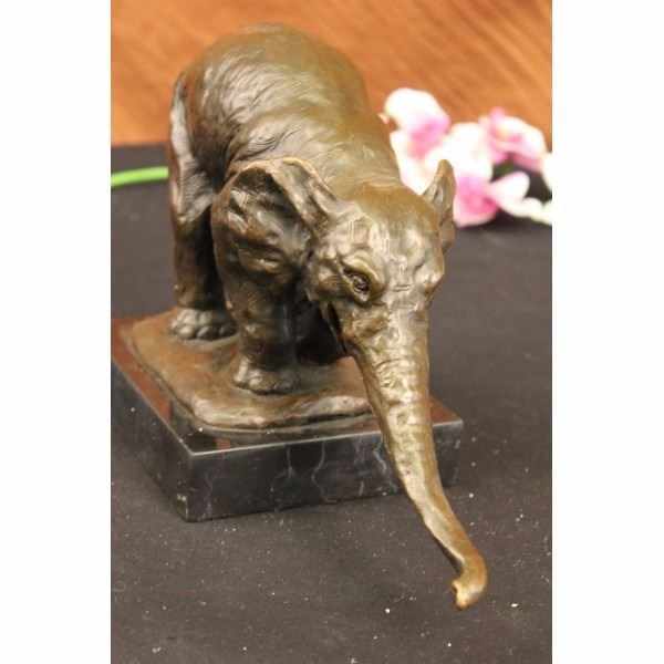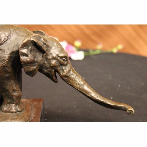 This happy elephant lets out a loud long shriek as she playfully walks across the dry dusty plains of the land. Although she is a very large size animal she is as agile and light on her feet. She bends her front leg as she walks and extends her trunk as far as it goes and continues to shriek. Her ears are flap back and forth as she gets rid of the flies. . Her tail hangs behind her and her eyes are wide. This is a beautiful sculpture depicting a happy elephant in her natural environment. If you look closely you can see the creases and texture of the skin. This bronze sculpture was cast using the "Lost Wax Method" and has a brown patina and is mounted on a gorgeous marble base. This sculpture is signed by Bugatti. The artists name is Rembrandt Bugatti; he came from a very famous family of artists. His uncle was a famous Italian Impressionist painter named Seguantini. His father was Carlo Bugatti, who was a painter, and also designed furniture. He made this fantastic Middle Eastern style furniture that was covered in parchment and copper and all kinds of wonderful jewels. He had a brother, Ettore Bugatti, who is the Italian car designer and one of the most expensive antique cars you can buy today. Rembrandt Bugatti was very successful right from the start. He started at a very young age. He signed a contract when he was only 20 years old to produce bronzes. He loved animals and did work of mostly animals. Most of his Bronze Sculptures are done in sort of an Impressionist style; they're wonderful because they really capture the spirit of the animal itself. You get a real feeling for the animal and how it behaves and the character.Condition: This sculpture is in a very Good condition. Bronze Dimensions with Marble Base:Height7 1/2" x Width11 1/2"Marble Dimensions: 6" X 5"Height without base:6 1/2" Weight :10 LBSInventory : 2943K16192 This happy elephant lets out a loud long shriek as she playfully walks across the dry dusty plains of the land. Although she is a very large size animal she is as agile and light on her feet. She bends her front leg as she walks and extends her trunk as far as it goes and continues to shriek. Her ears are flap back and forth as she gets rid o