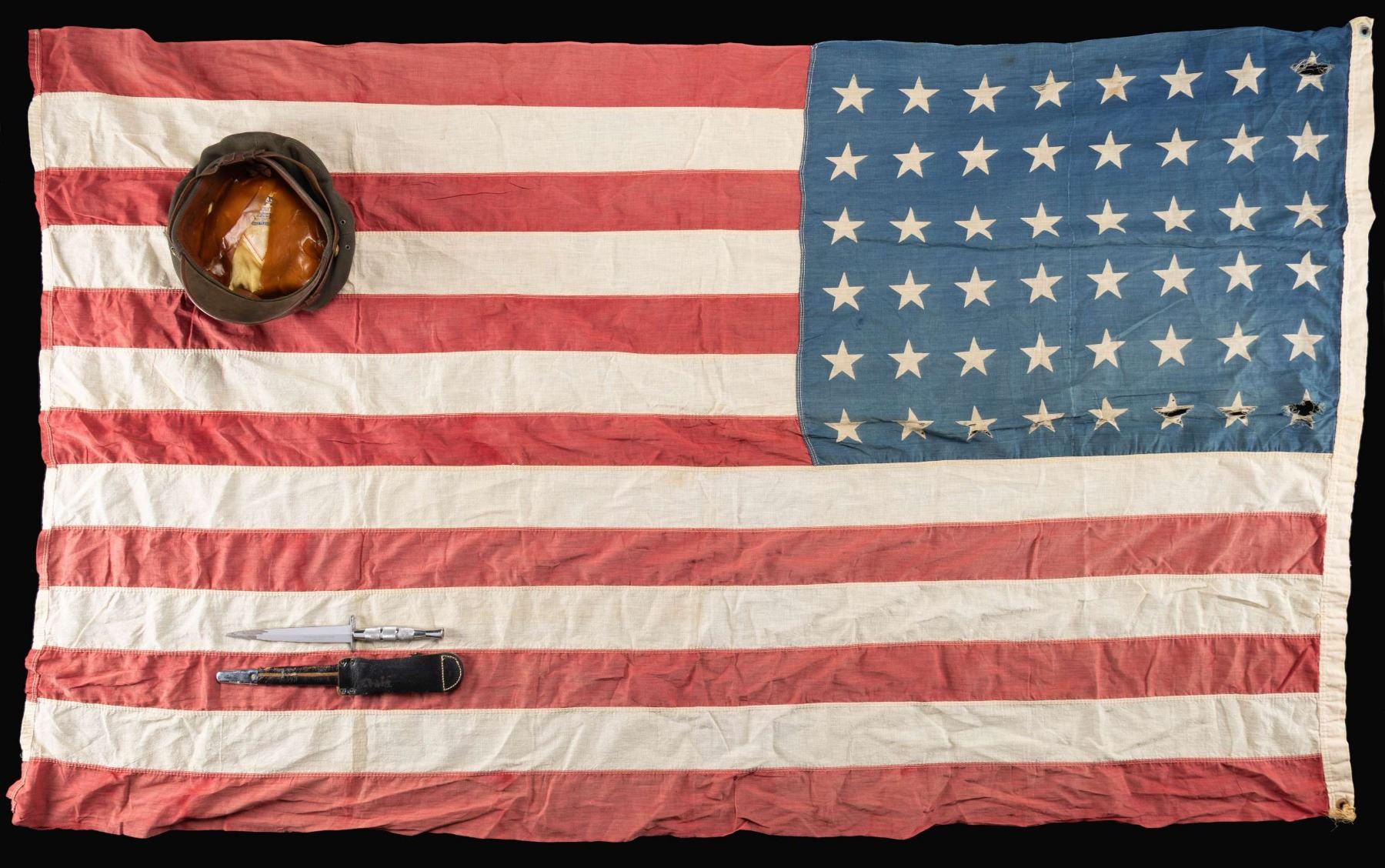 This lot contains a interesting OSS stiletto style knife that measures11 1/2" in length. The entire knife has been chrome plated. The blade has a raised medial ridge and is engraved "5TH SPECIAL FORCES GROUP VIETNAM". The crossguard is stamped "JAPAN SWORD" and the grip shows 3 areas of raised crosshatching. The black leather sheath has a plated tip. The lot also include a WWII US Officer's' crusher type visor cap and a 48 star flag. CONDITION: knife is solid but the plating is peeling on the blade. The snap on the scabbard is missing. Crusher cap is very nice with a split sweat shield. (02-24445-2/BF). $300-500.