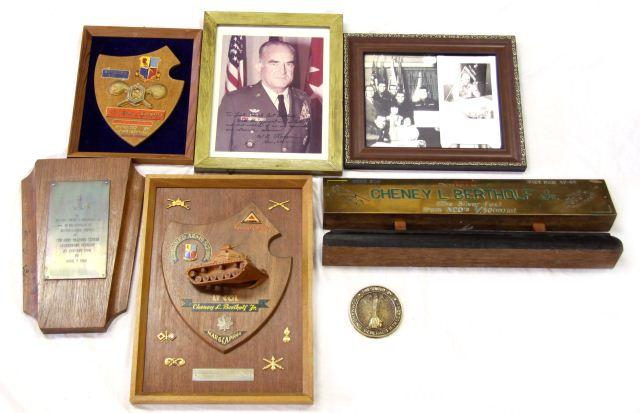 An interesting lot of plaques named to decorated LTC Cheney L. Bertholf, including: a 19.5x6.5 inch presentation Bong Son Vietnam 67-68 desk name plate "from NCO's 1/50(m) inf." to Bertholf (The Silver Fox), an 11.5x15.5 inch Combined Arms School Seventh Army plaque, 10x13 inch framed signed photograph of Gen. William B. Rosson to Bertholf, (2) wooden plaque from 7th Army Training Center (including one for distinguished service), bronze plaque presented by the Commanding General of the Fifth US Army, and several staff photographs. Very good condition.