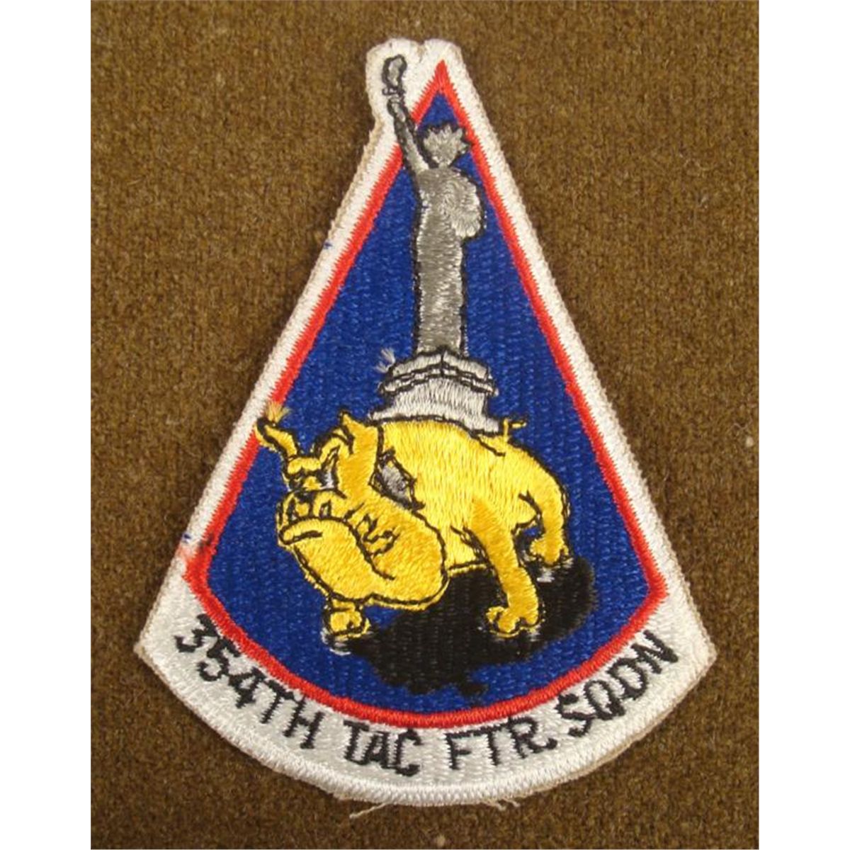HERE IS A VIETNAM ERA -354 TACTICAL FIGHTER SQUADRON PATCH. THE STATUE OF LIBERTY IS ON THE BULLDOGS HEAD. IT IS APPROXIMATELY 3X4", WITH A NICE EMBROIDERY. *