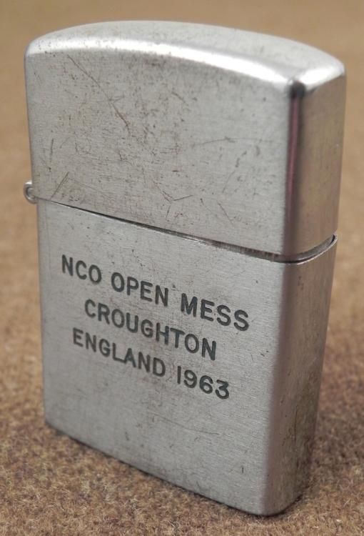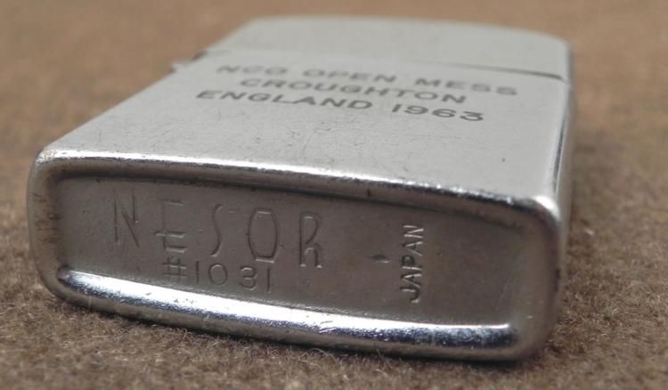THIS IS A VIETNAM ERA LIGHTER, "NCO OPEN MESS CROUGHTON ENGLAND-1963". IT HAS A FLIP TOP, IS BRUSHED SILVER AND THE BOTTOM IS MARKED NESOR #1031-JAPAN. THE LIGHTER HAS BEEN UN-TESTED. *