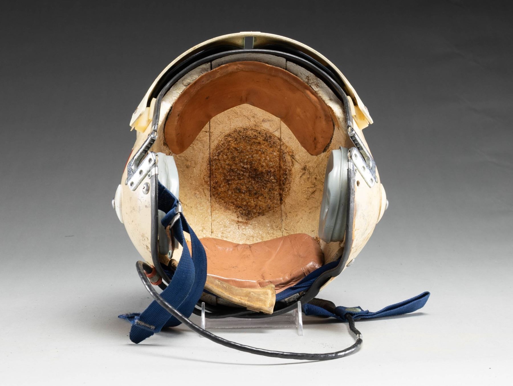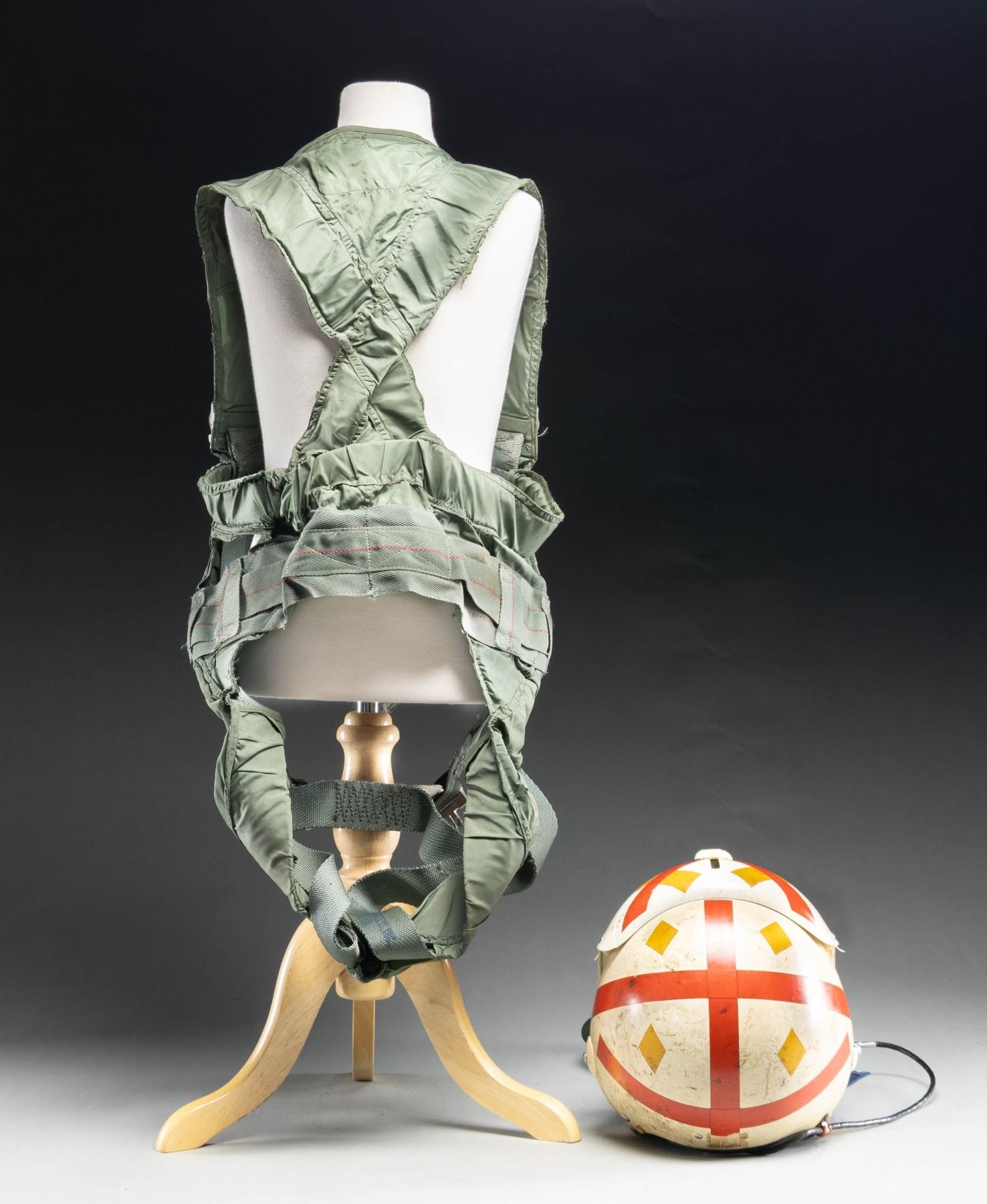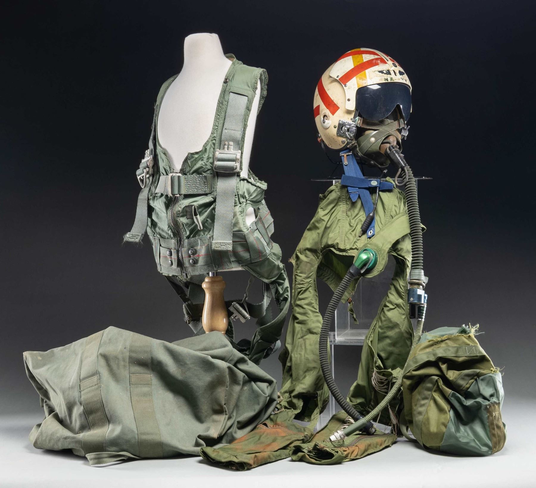 This lot consists of the following military aviation items: 1) US Navy Aviation Helmet. Appears to be an APH-6 variant. Front of helmet has partial "NAVY" sticker. CONDITION: One of the internal pads is missing & sides have some chipping. Paint shows flaking & age related war. Liner shows staining & some flaking. 2) Redar A10116 Breathing Hose. Mask present. CONDITION: hose shows large electrical tape repair & scattered age related wear. 3) US Navy Flyers Tent & Awning Bag. 1968 dated. CONDITION: bag shows some staining & aviation wear. 4) Anti G Cutaway Mark 2A. Large size & 1967 dated. CONDITION: item shows some age related war & fraying along the edges. 5) US Navy Integrated Torso Harness MA-2. 8LR size, 1970 dated & has added name "SINGLETON". CONDITION: shows some fraying & age related wear. (02-24448/MJC). NON-GUN. $1,000-1,500 for lot.