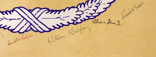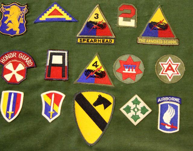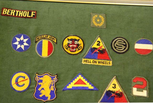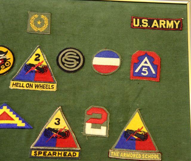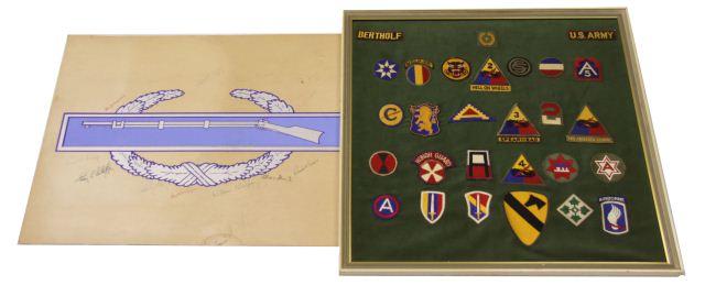 A collection of Lt. Col. Bertholf's career patch collection, a highly decorated office with a varied military history, Air Cav. , Airborne, Armor and more, also a signed by the officers and also Bertholf a 12x28 inch Combat Infantry Badge, some damage to the board.