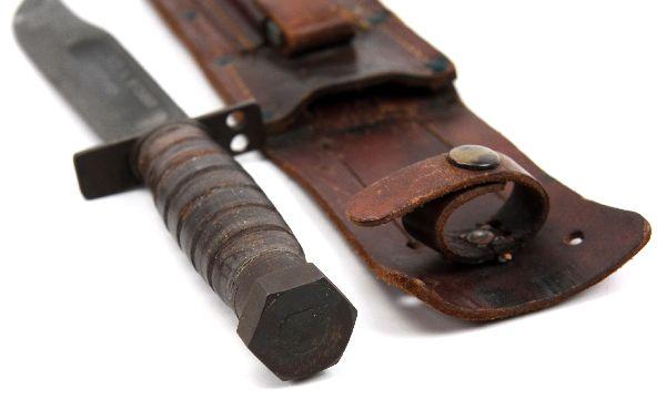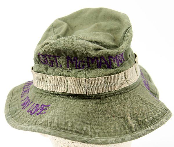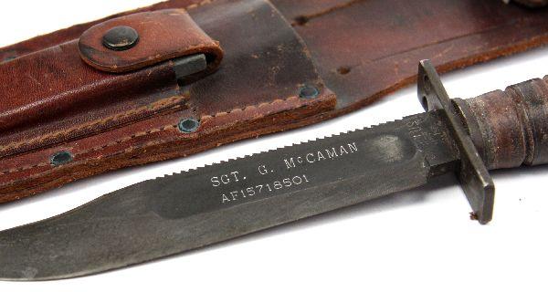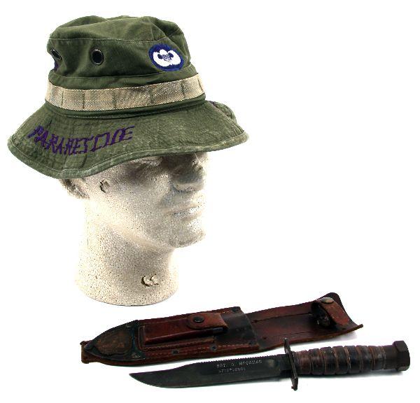 A Para Rescue knife and sheath, with U.S.A.F unit insignia at bottom of sheath. Camillus blade named to Sgt. G. McCaman. Handle snap is separated from sheath. Dilly hat embroidered "Para rescue That Others May Live" and named. Jump wing patch attached. Hat is a rip stop size 6 7/8